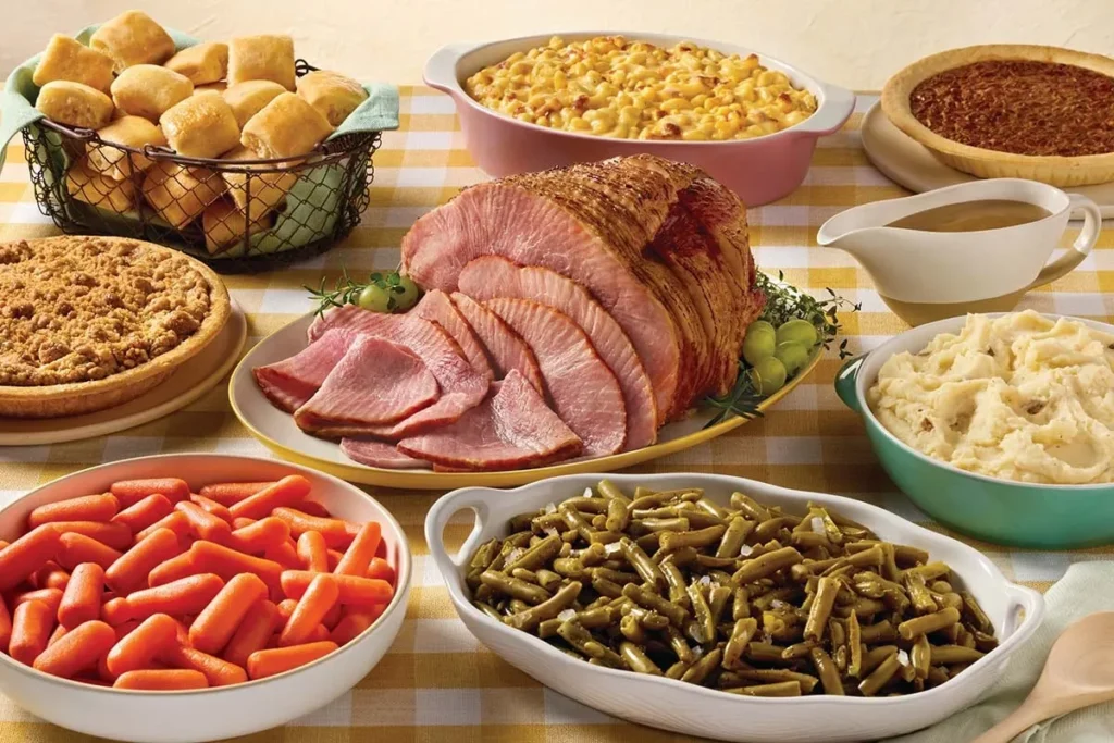 | Easter Ham Heat n’ Serve Family Dinner | Spiral sliced Sugar-Cured Ham, Mac n’ Cheese, Mashed Potatoes with Roasted Gravy, Green Beans, Sweet Yeast Rolls | 4-6 | $124.99 | 12880 cal |