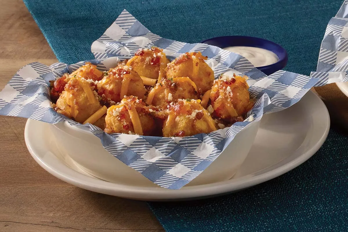 Cracker Barrel’s Loaded Hashbrown Casserole Tots feature crispy hashbrown tots loaded with melted cheese, bacon, and green onions.